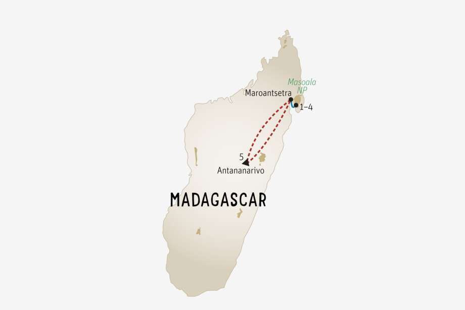 1ᴱᴿ JOUR: Antananarivo–Parc national de Masoala. Transfert à l'aéroport d'Antananarivo. Vol en petit avion (charter) à destination de la petite ville côtière de Maroantsetra, puis transfert routier jusqu'au port et traversée en bateau de la baie d'Antongil jusqu'au Masoala Forest Lodge. Accueil et installation dans le camp. Les activités de l'après-midi comprennent l'exploration des plages et de la forêt côtière dans la zone du lodge, ainsi qu'une baignade en mer. Vous rencontrerez les autres clients à l'heure du cocktail autour du feu de camp pour profiter du coucher de soleil. Nuitée au Masoala Forest Lodge (DS)