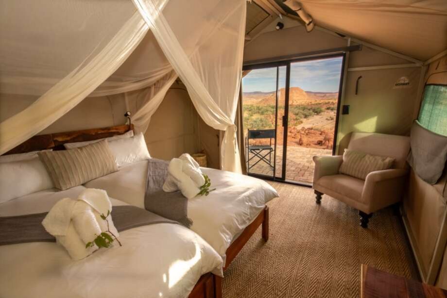 Les tentes safari confortables de style Meru sont équipées de fenêtres allant du sol au plafond, d'une salle de bain en briques avec douche, ainsi que d'un ventilateur. La véranda privée offre des vues magnifiques sur le paysage désertique.