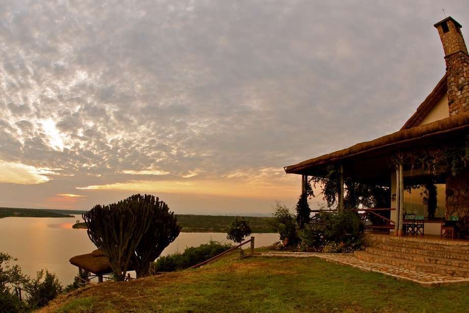 Erhöht auf einem Hügel mit atemberaubender Aussicht auf den Kazinga Channel und den Lake Edward.